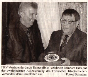 Als Mitglied des Schiedsgerichtes und Arbeitsausschusses Boßeln und vor allem als Kassenwart, der seinerzeit eine leere Holzkiste übernommen hatte, war Reinhard Eilts im LKV Ostfriesland aktiv. Der Vorsitzende des Friesischen Klootschießer-Verbandes, Jardo Tapper, überraschte den Leerhafer auf der Jahreshauptversammlung des LKV Ostfriesland am 21. Februar 2003 mit der zweithöchsten Auszeichnung seines Verbandes, den FKV - Ehrenteller, den Eilts sichtlich bewegt in Empfang nahm.